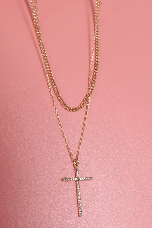 DOUBLE LAYER RHINESTONE CROSS CHARM NECKLACE