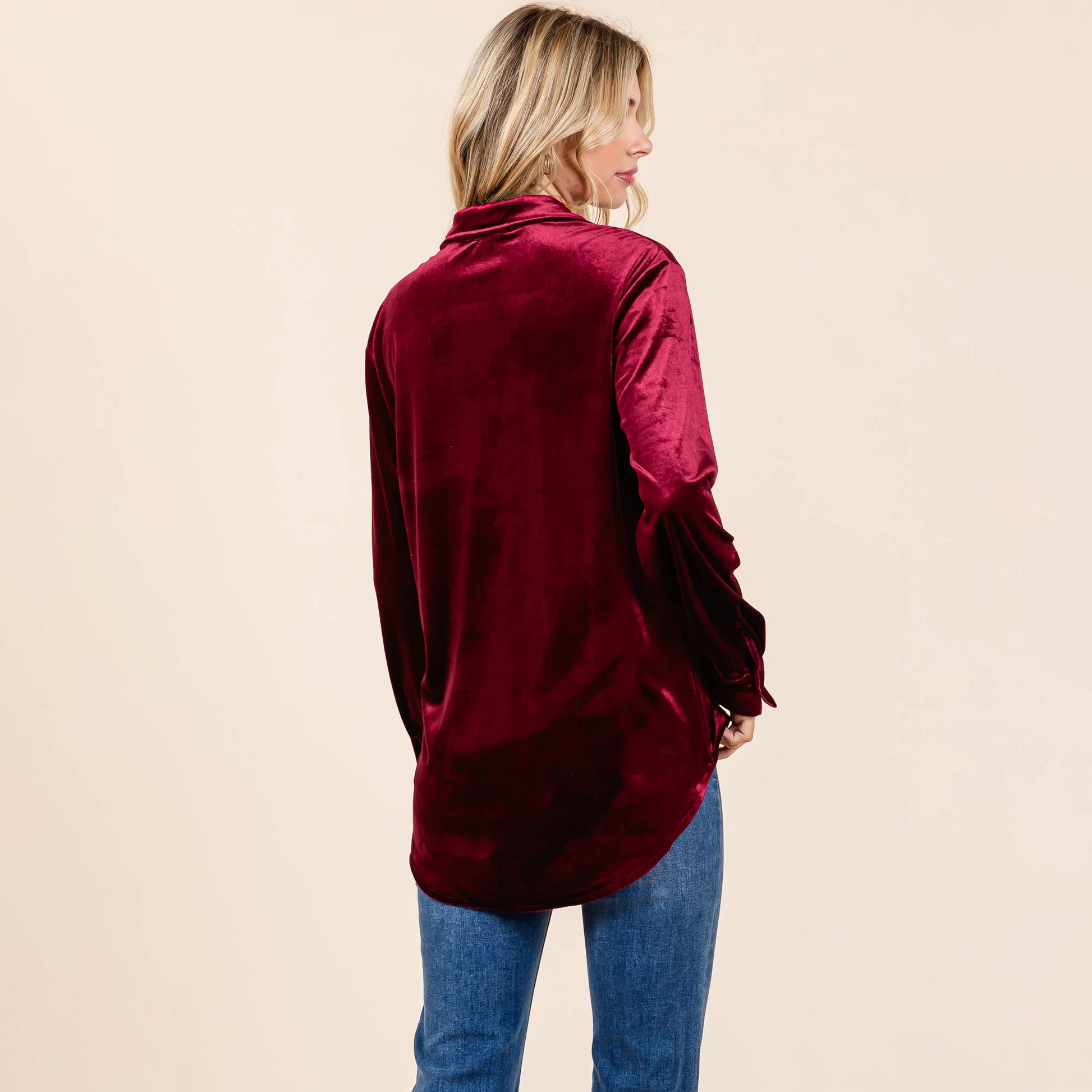 2 front pockets. Collared. V Neck. Button Up. Velvet material. High Low.