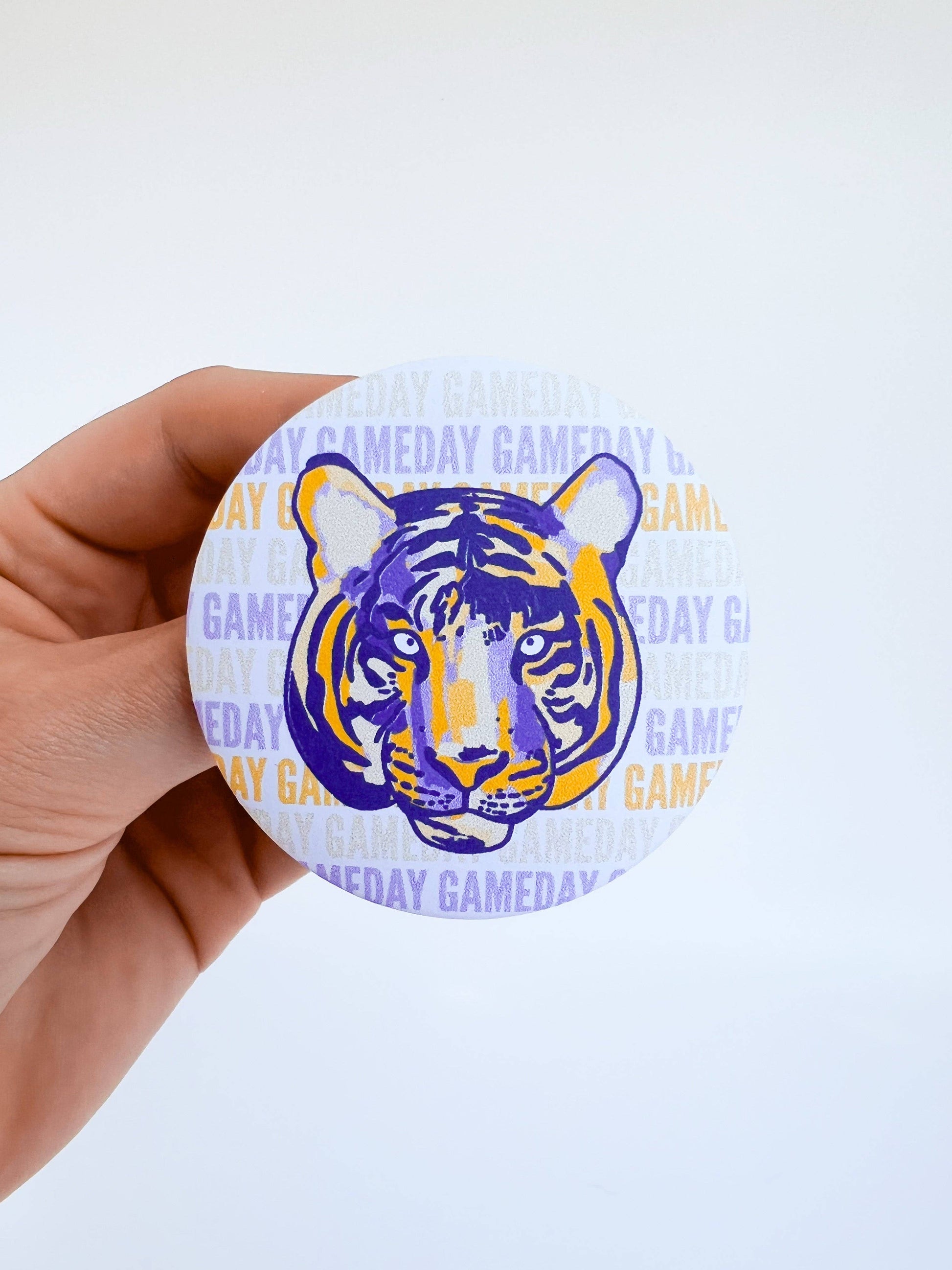 Each pinback button is 2.25 inch diameter with a plastic protective covering. It's the perfect size for stacking and won't distract from your outfit!